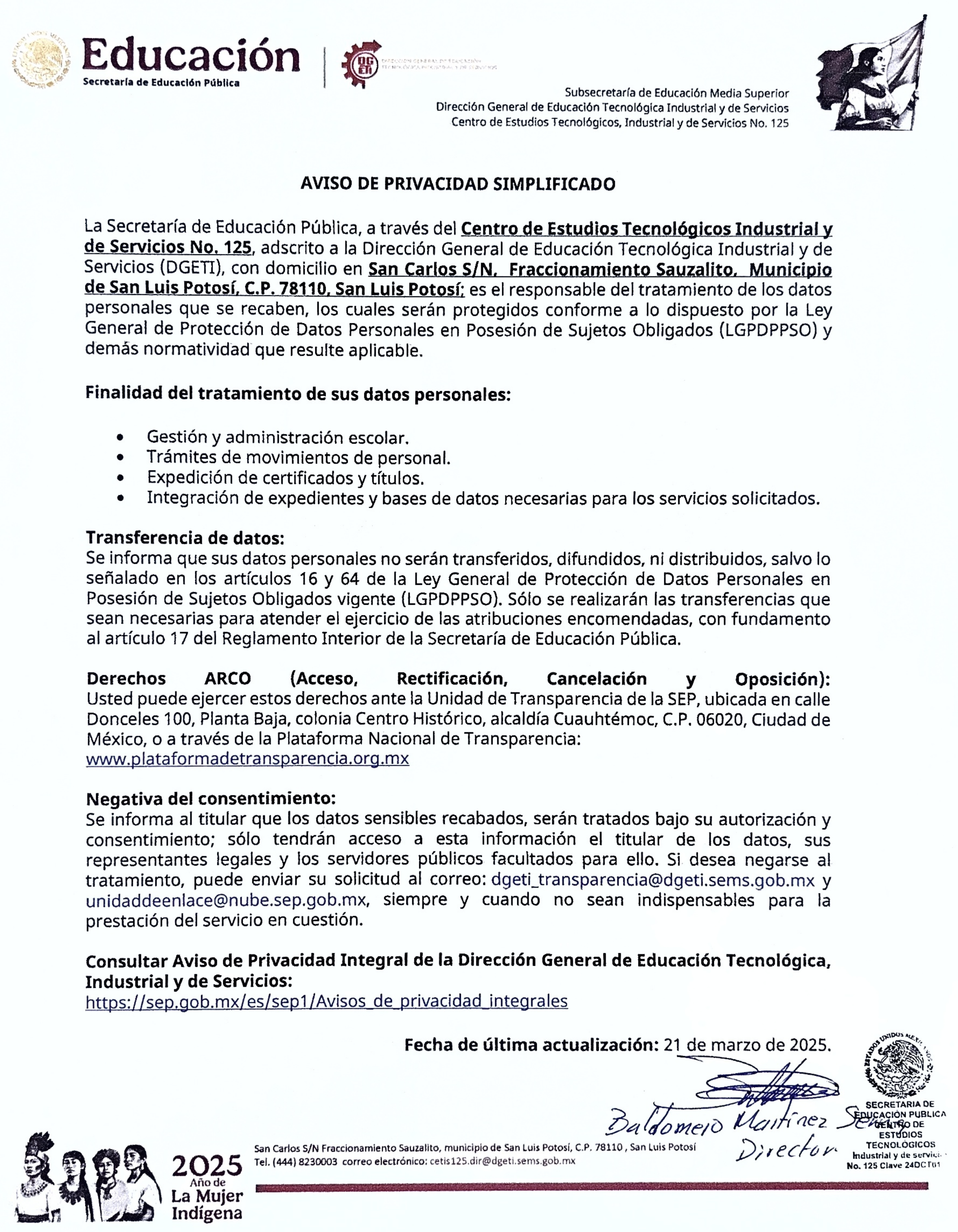 En el Centro de Estudios Tecnológico, Industrial y de Servicios No. 125, nos comprometemos a proteger la privacidad y los datos personales de nuestros alumnos, padres de familia o tutores. De acuerdo con la Ley General de Protección de Datos Personales en Posesión de Sujetos Obligados (LGPDPPSO), por lo que ponemos a su disposición los siguientes avisos: